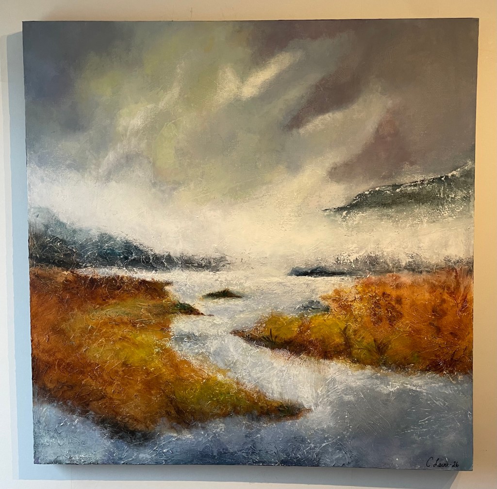 «Høstens pust mot havet» Akryl på Lerret 90×90 cm med bred kant. Pris 4500,-